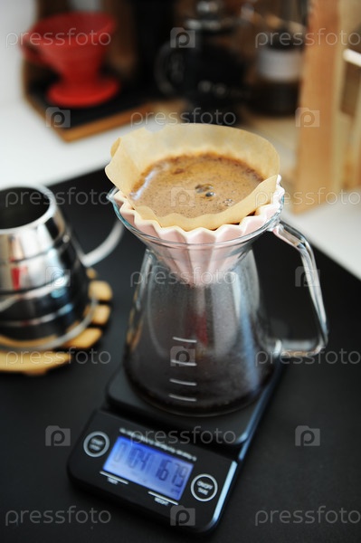 Альтернативная заварка черного кофе с фильтром и розовой капельницей оригами. Электронная шкала таймера. Концепция специальности