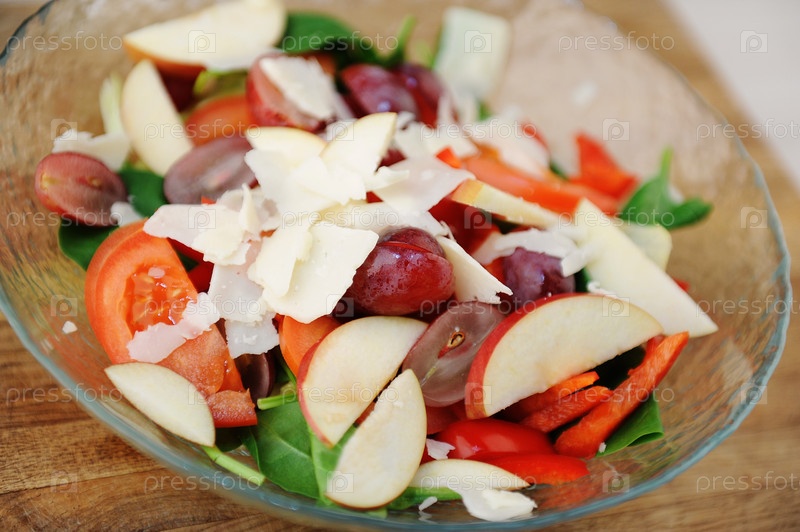 Многокомпонентный овощной сытный салат в миске на деревянной доске