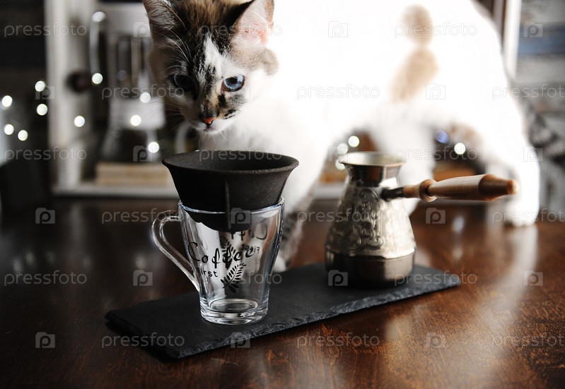 Белый пушистый голубоглазый кот с кофейными принадлежностями. Пористый керамический фильтр и турка. Размытые огни на заднем плане