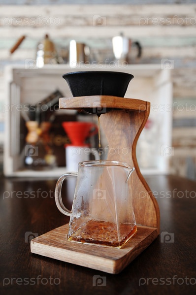 Приготовление кофе в черном безбумажном пористом керамическом фарфоровом фильтре на деревянной кофейной станции. Пивоваренные устройства в фоновом режиме
