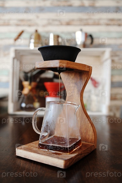 Приготовление кофе в черном безбумажном пористом керамическом фарфоровом фильтре на деревянной кофейной станции. Пивоваренные устройства в фоновом режиме