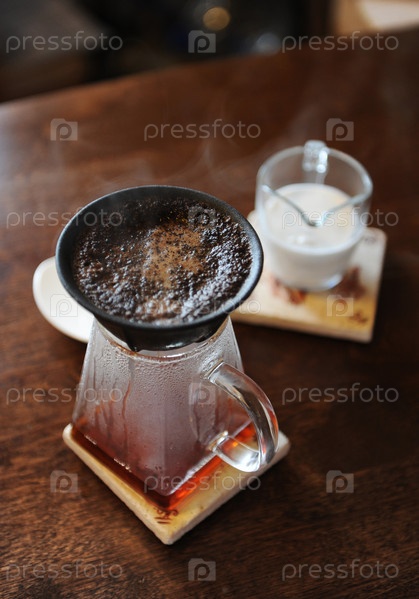Приготовление кофе в черном безбумажном пористом керамическом фарфоровом фильтре на стеклянном кувшине. Белая чашка и молочник со сливками