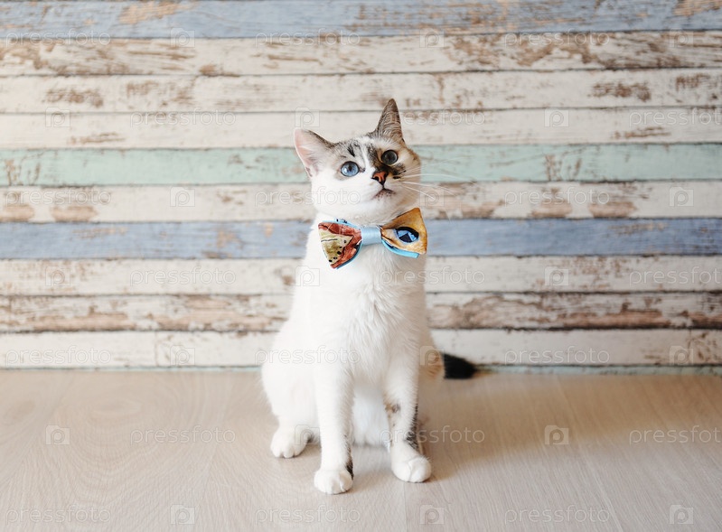 Белый пушистый голубоглазый кот в галстуке-бабочке на фоне старинной деревянной стены