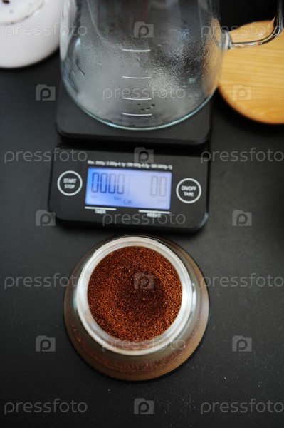 Свежемолотый кофе в ручной кофемолке, вид сверху. Электронные весы с таймером