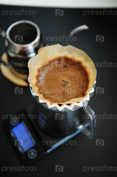 Альтернативная заварка черного кофе с фильтром и розовой капельницей оригами. Электронная шкала таймера. Концепция специальности
