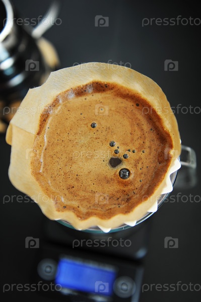 Альтернативная заварка черного кофе с фильтром и розовой капельницей оригами. Электронная шкала таймера. Концепция специальности