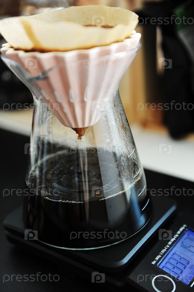 Альтернативный черный кофе с фильтром, завариваемый розовой капельницей оригами. Концепция специальности. Капает крупным планом