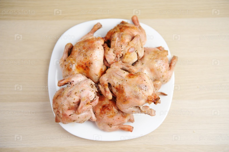 Шесть запеченных корнуолльских кур на белой тарелке, вид сверху