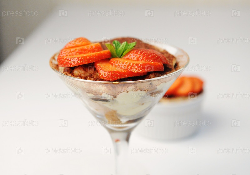 Десерт тирамису в бокале для мартини. Украшен ломтиками клубники и мятой. Белый фон, изолированные