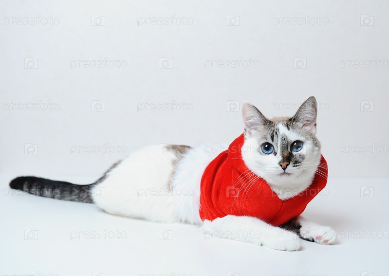 Симпатичная голубоглазая кошка в красной рождественской толстовке с мехом лежит на белом фоне. Свободное пространство, изолированное