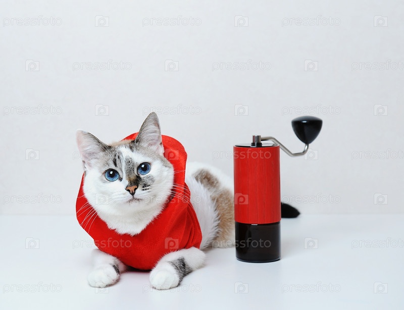 Милый голубоглазый кот в красной рождественской толстовке лежит на белом фоне. С ручной кофемолкой. Свободное пространство, изолированное