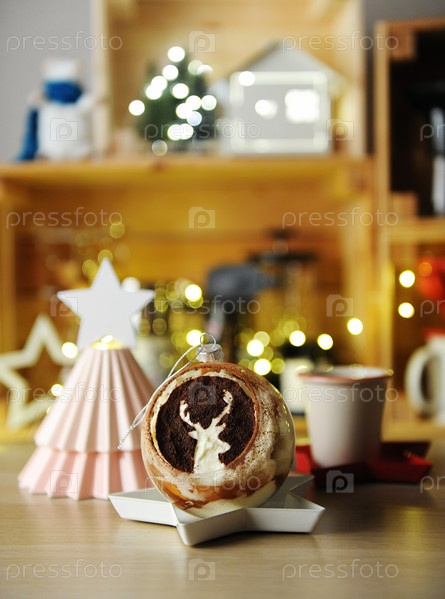 Тирамису подают в стеклянной посуде в виде елочного шара с изображением оленя. Размытые огни на заднем плане