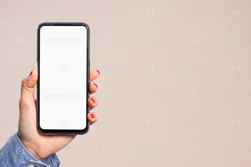 Женская рука вертикально держит смартфон с пустым белым экраном на кремовом фоне