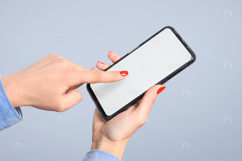 Смартфон в руках женщины, на синем фоне