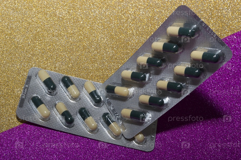 Капсулы бело-зеленые на розово-желтом фоне. Лекарственный препарат