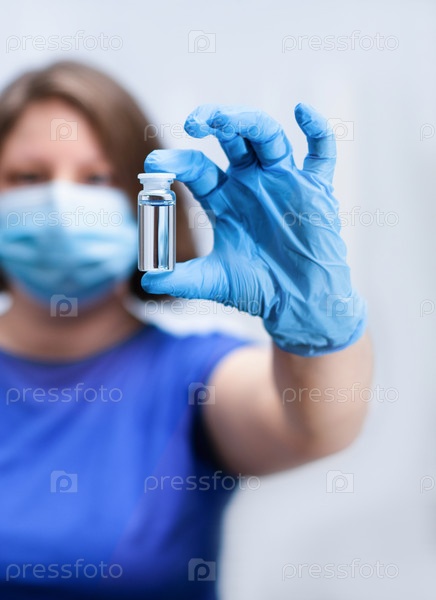 Женщина-врач в перчатках и медицинской маске держит в руке ампулу с лекарством
