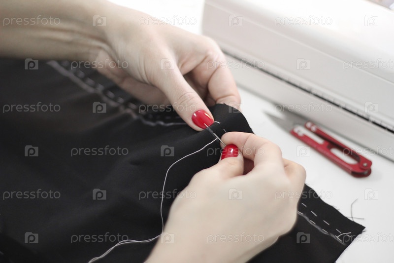 Женские руки с красным маникюром шьют брюки. Наметочный шов, ручная работа