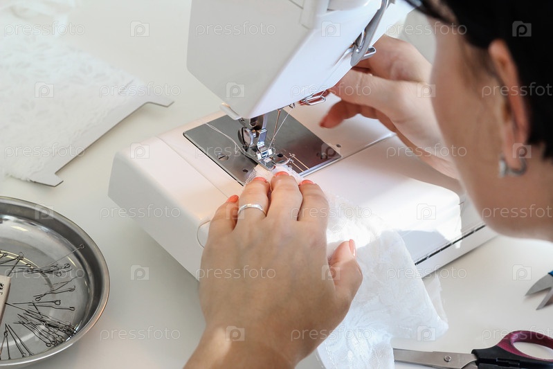 Женщина, европейка, шьет кружевное белое нижнее белье за швейной машинкой