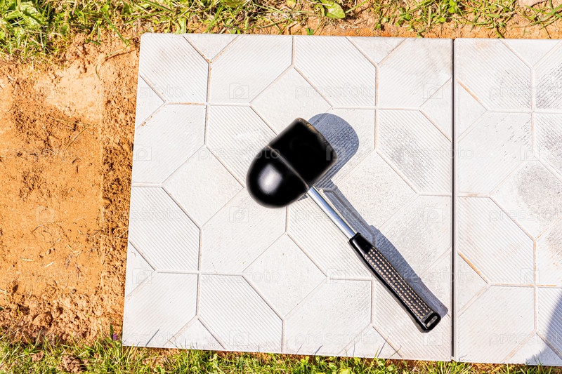 Резиновый строительный молоток для укладки тротуарной или садовой плитки на даче, коттедж лежит на белокаменной плите. концепция строительных работ