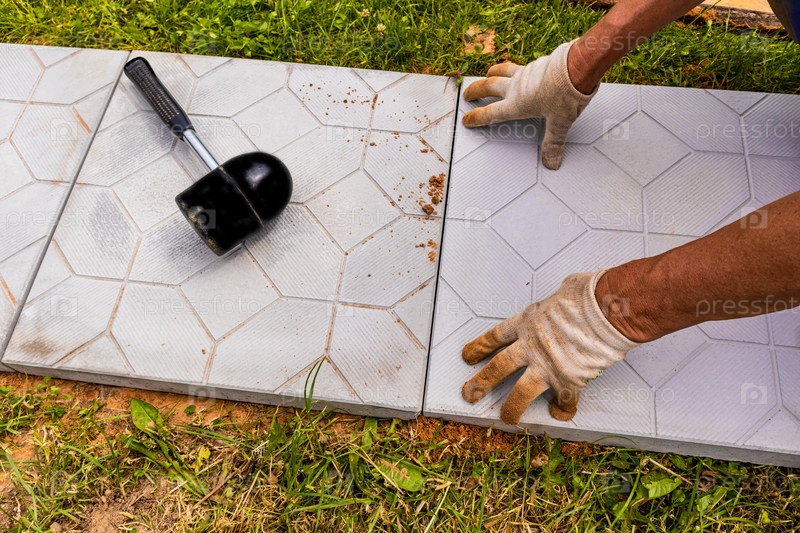 Руки рабочего в перчатках укладывают плитку в загородном доме, коттедже. Ландшафтный дизайн. укладка каменной плитки
