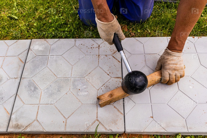 Мастер укладывает брусчатку слоями. Мощение садовой дорожки кирпичом. Укладка бетонной тротуарной плитки во дворе дома на песчаный фундамент