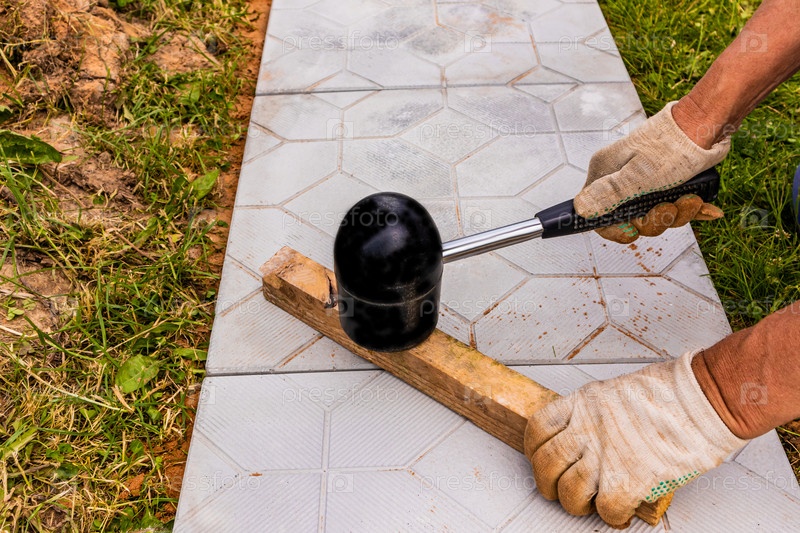 Процесс укладки садовой каменной плитки для дорожки в загородном доме, коттедже. работают руки мастера специальным резиновым молотком