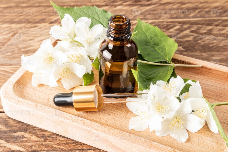 Открытый флакон жасминовой сыворотки и пипетка, наполненная косметическим натуральным средством по уходу за кожей лица. витамин А, Е. деревянный фон