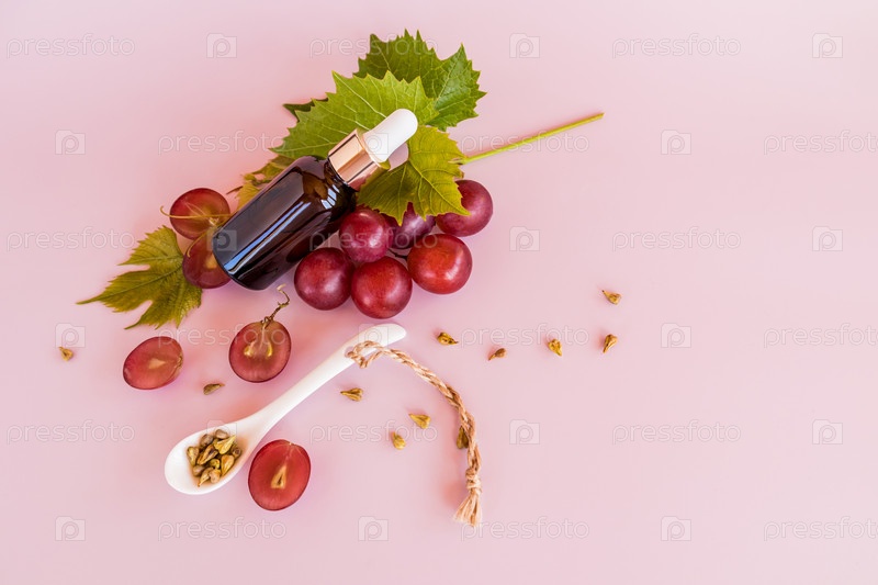 Вид сверху на косметическую стеклянную бутылку из темного стекла с органическим виноградным маслом или сывороткой для лица на основе виноградных косточек. место для текста