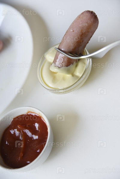 Жареная мясная колбаса с соусами на белом фоне. Вкусный мясной завтрак с майонезом и кетчупом