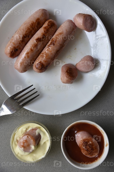 Жареная мясная колбаса с соусами на сером фоне. Мясной завтрак с колбасой и соусами на тарелке с вилкой