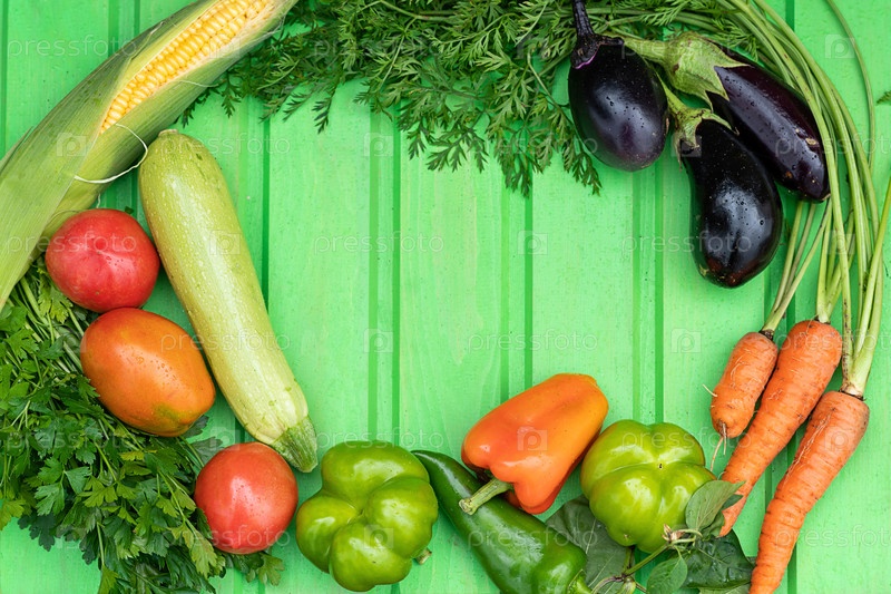 Свежесобранные овощи для приготовления овощного рагу на зеленом деревянном фоне