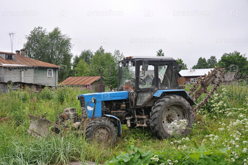 Трактор. Тракторист в деревне. Деревня летом. Россия
