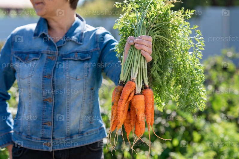 Женская рука держит кучу моркови. Доставка свежесобранных овощей прямо с грядки к вашему столу