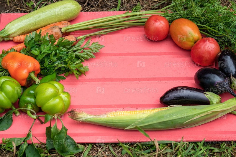 Свежесобранные овощи для приготовления овощного рагу на розовом деревянном фоне