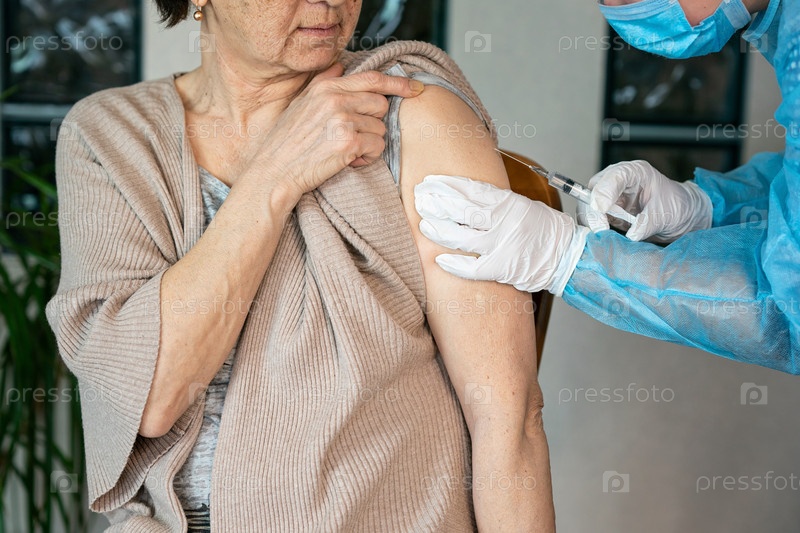 Пожилой женщине делают прививку в плечо. Прививка от коронавируса. Вакцинация старого пациента в клинике с копировальным пространством. Врач делает укол пожилой женщине в больнице
