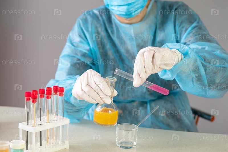 Лаборант сидит в лаборатории и проводит химические опыты по разработке новой вакцины. Химик работает в лаборатории и проводит исследования