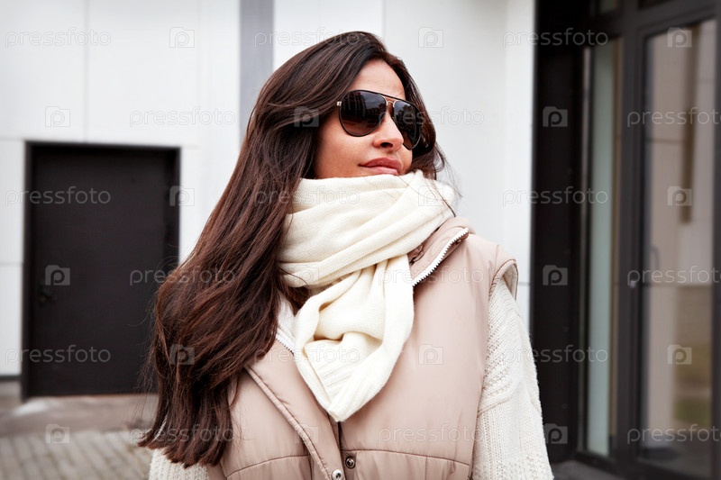 Крупным планом Портрет красивой женщины, глядя на улицу. Стильная модель с длинными волосами брюнетки в солнечных очках, вязаном белом шарфе и свитере, бежевом жилете