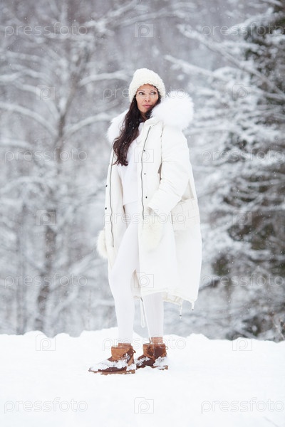 Открытый полный портрет молодой красивой модной женщины в стильном белом зимнем пуховике, вязаной шапке, варежках, леггинсах. Модель позирует на природе. Концепция тенденции женской моды