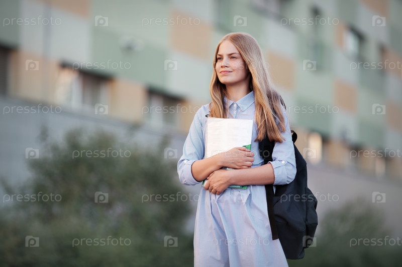 Первый день обратно в школу. старшеклассница портрет модели-подростка с длинными светлыми волосами с рюкзаком, учебниками и тетрадями
