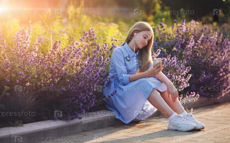 Красивая блондинка слушает музыку на своем смартфоне через наушники, сидит в цветах