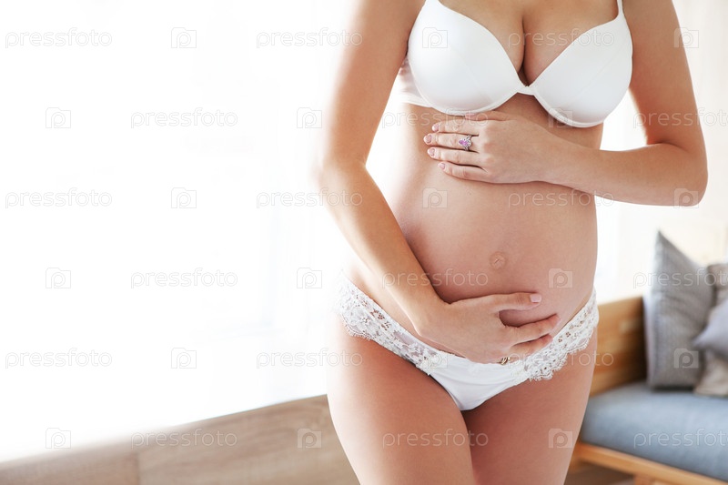 Крупным планом живот беременной женщины. Беременная мать в нижнем белье обнимает живот дома, у окна. Белая Пустота, свет и нежность
