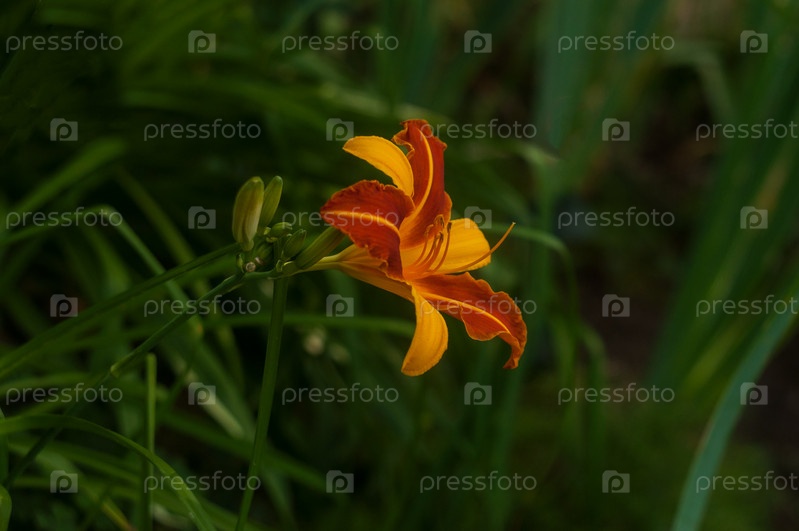 Красно-оранжевый лилейник крупным планом на зеленом фоне