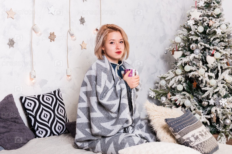 Блондинка, укутавшись в одеяло, сидит на кровати возле елки