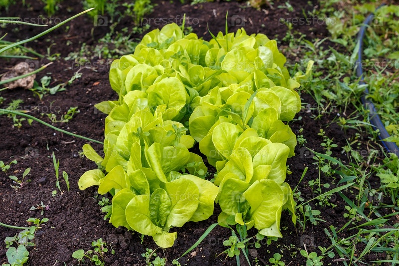 Молодые зеленые листья салата на грядке в огороде