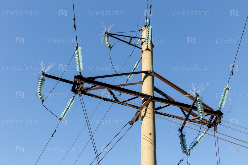 Железобетонная опора ЛЭП со стеклянными изоляторами и птице защитными устройствами