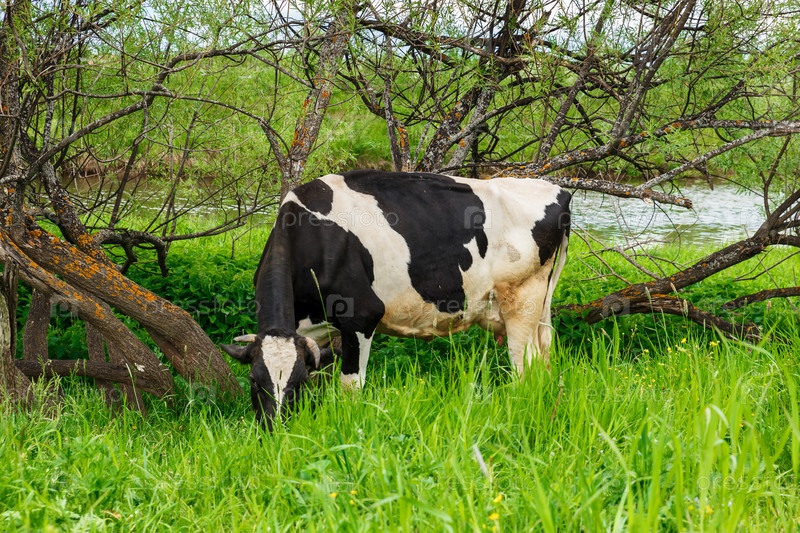 Корова ест зеленую траву на пастбище около реки