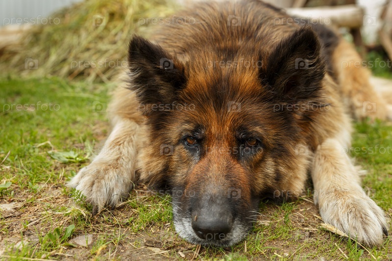 Немецкая овчарка. Грустная собака лежит на земле и смотрит в камеру