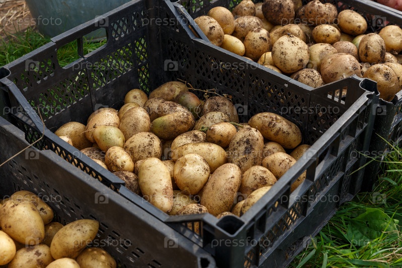 Свежий картофель в пластиковых ящиках. Урожай картофеля