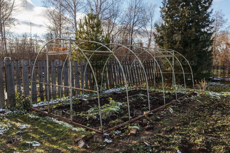 Стальной каркас для теплицы из поликарбоната в саду. Осень