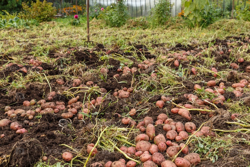 Сбор урожая картофеля. Выкопанный картофель лежит на земле в огороде